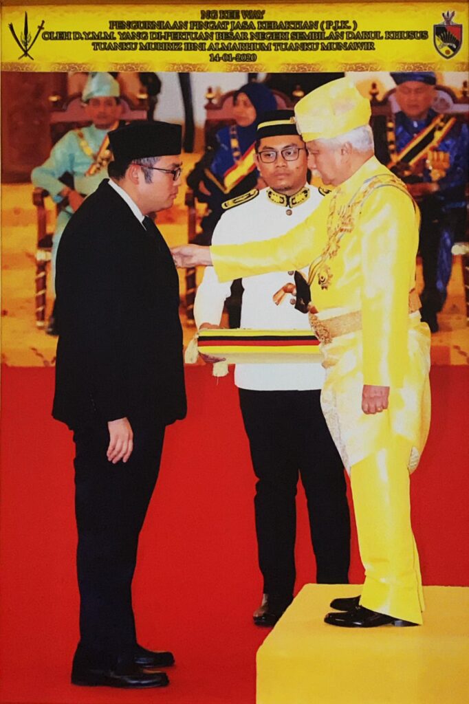 黄志威律师在森美兰州最高统治者, 端姑慕力兹殿下(Tuanku Muhriz ibni Almarhum Tuanku Munawir)七十二岁华诞庆典册封仪式中,蒙殿下御准,荣膺「有功勋章」(Pingat Jasa Kebaktian,P.J.K.)